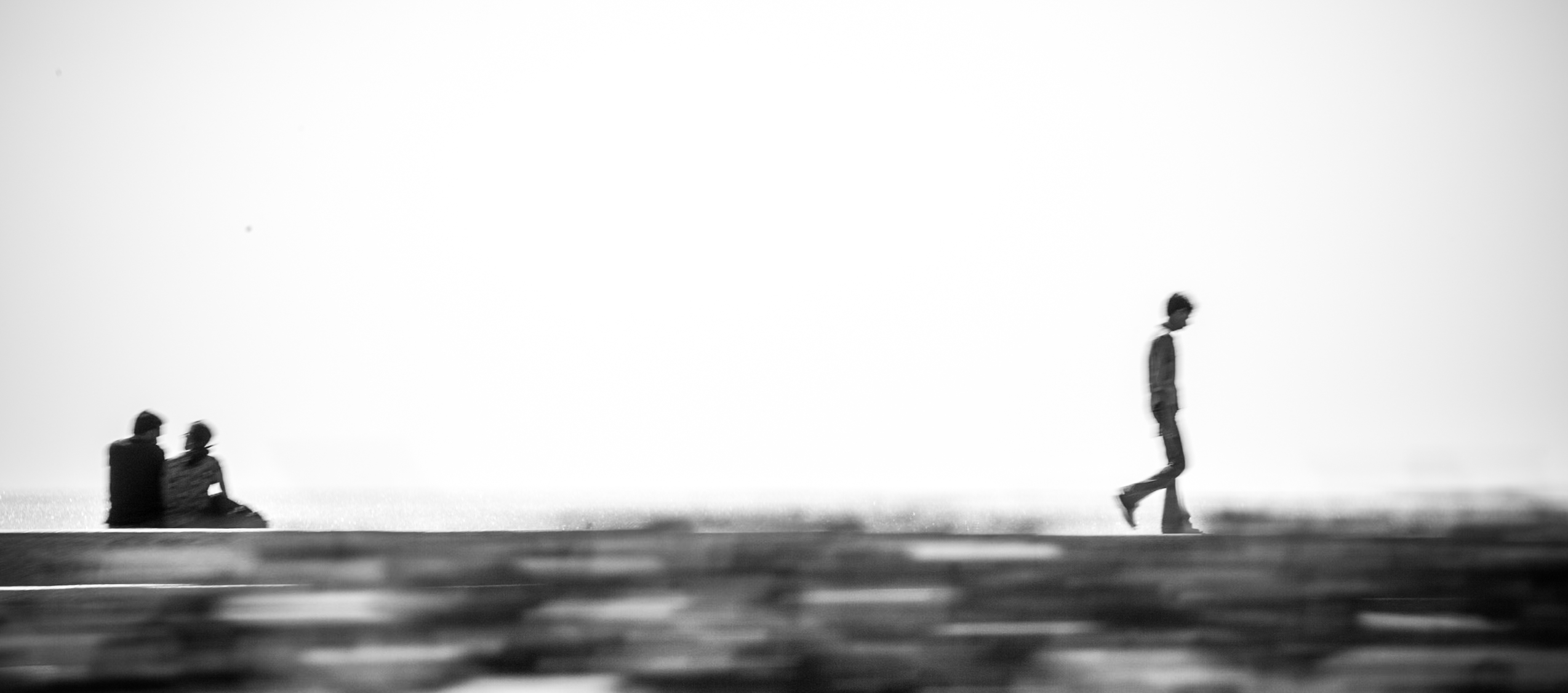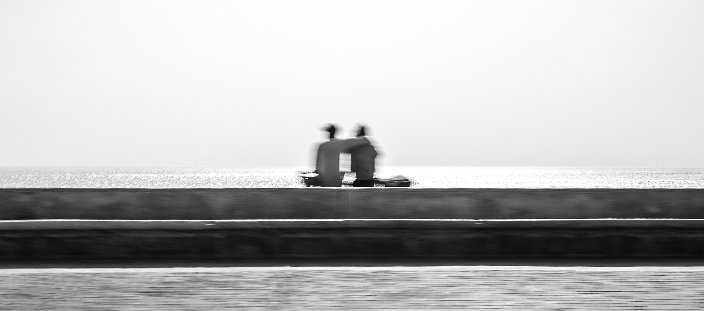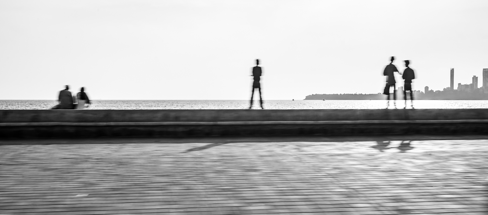 Marine Drive-by is a study of transience, captured from the window of a moving taxi along Marine Drive in Bombay. Using slow shutter speeds, the images blur pedestrians mid-stride, rendering them as streaks of motion—half-formed, already vanishing. The dual movement of photographer and subject turns each frame into a collaboration between motion, chance, and time.